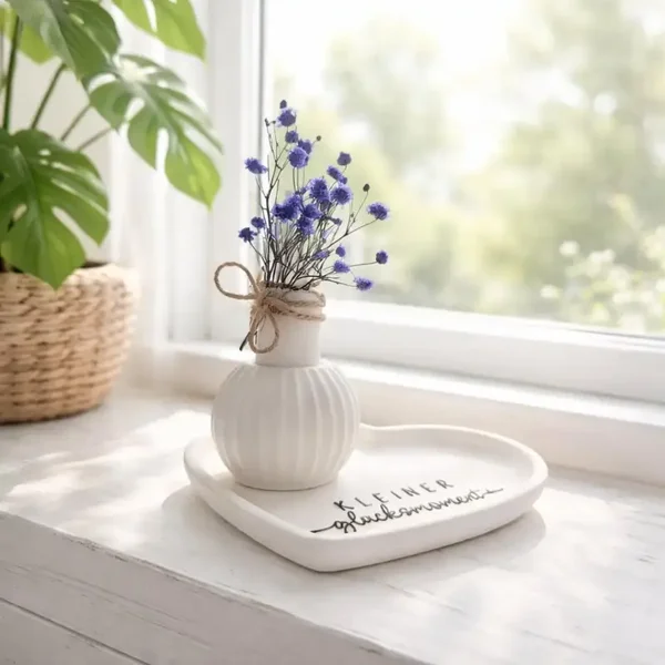 Dieses liebevoll gestaltete Deko Set mit Kerzenständer und Herz-Unterlage vereint schlichte Eleganz mit einem natürlichen Look. Der weiße Kerzenständer aus Resin steht auf einer passenden Herzschale und wird durch feine Trockenblumen ergänzt – perfekt für eine ruhige, moderne Wohnatmosphäre.
